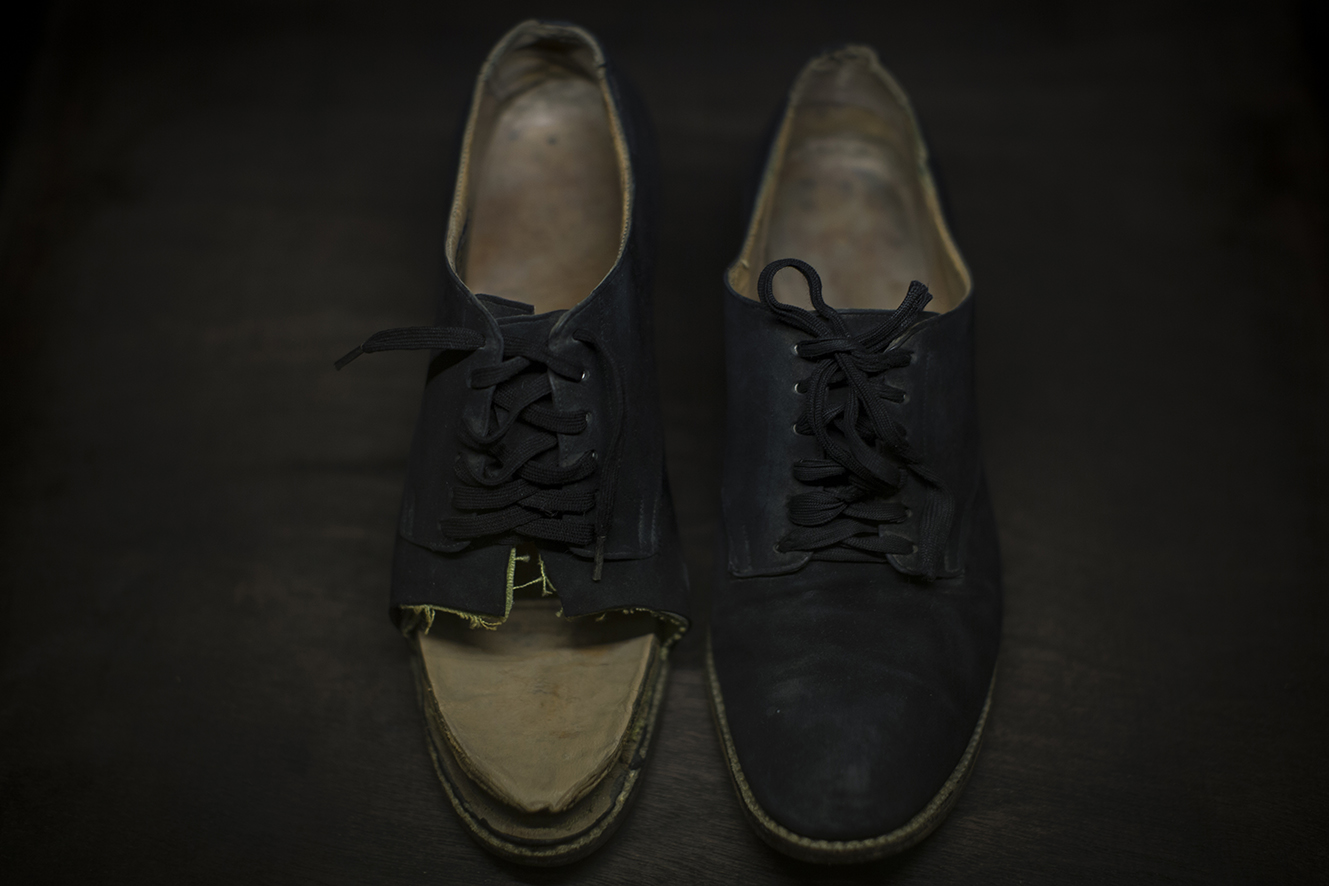 Pair of black shoes, the right shoe intervened after the amputation of several phalanges from the toes of that foot
