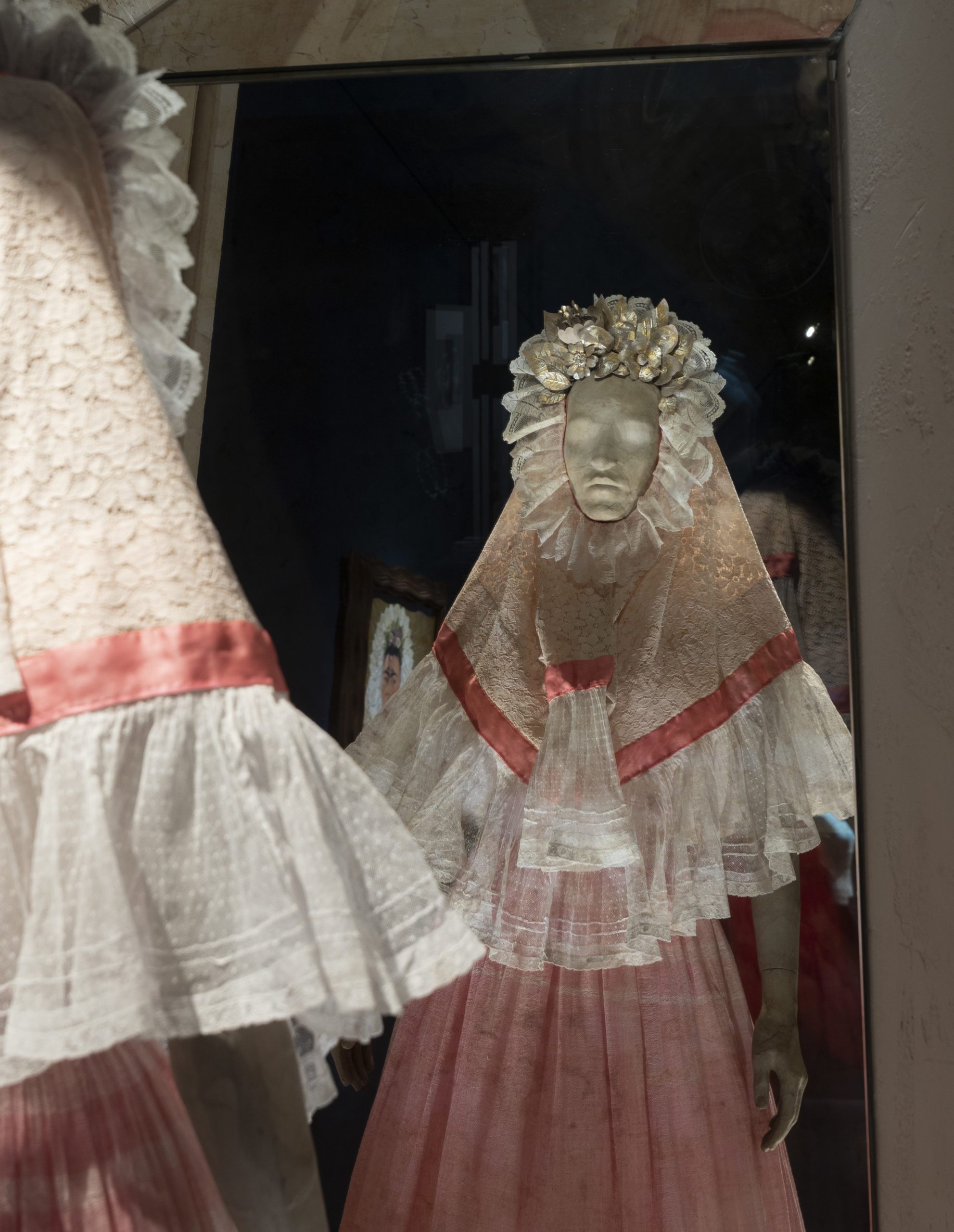 This “resplandor” or headdress that Frida wore in portraits and photos is used on special occasions by women in Tehuantepec. This head “huipil,” as it is also known, focuses attention on the face of Tehuana women and is one of the most distinctive accessories of attire on the isthmus.