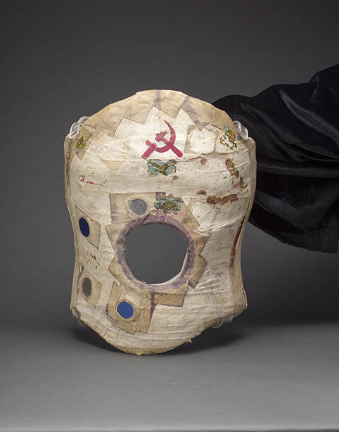 Not all post-surgery corsets that Frida used have the same shape; this one has an opening in the center, perhaps to allow air flow to reach her skin. Frida incorporated mirrors—elements that she used frequently—as well as the symbol of the hammer and sickle, proclaiming her political affiliation.